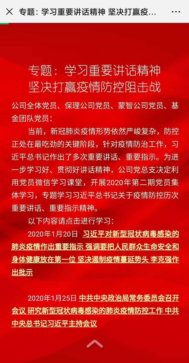 新冠肺炎疫情发生以来,为进一步落实疫情防治责任,贯彻“减少人员聚集”等要求,星空官方网页版,星空(中国)充分依托“互联网+”载体,开展了形式多样的学习教育,保障党员职工教育安全、有序、有效开展,为打赢疫情防控阻击战和推进公司高质量发展提供了理论武装和智力支持。